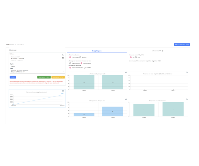 number of pallets scanned, error rate, discrepancies detected, progress status by warehouse or by zone.