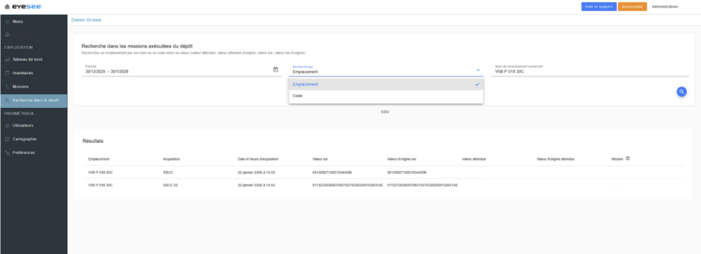 From EYESEE Cloud, define the scope and launch your mission in just a few clicks (zones, expected data, 1D/2D codes, reading rules, parameters, etc…).